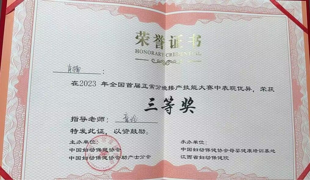在做了充分的准备后,她以饱满的精神状态,沉着应对比赛。比赛中,评委们根据接产步骤、顺序、要点以及与产妇沟通等过程进行严格评分。即便如此,肖楠仍旧保持着有条不紊的操作,她的动作紧密流畅、规范娴熟,充分展现了积极向上的精神风貌和高超的专业技能。最终,凭借专业的助产知识、敏锐的临床思维、规范的技能操作、细致的人文关怀,肖楠赢得了评委们的一致认可,她举手投足间都充分展示出了过硬的助产理论素养和丰富的知识储备,展现出了当代助产人员专业严谨而又温柔智慧的风采。最终,肖楠不负众望获得了首届全国分娩接产技能大赛三等奖,其他获奖选手大多都是医疗机构工作多年的专业人员。