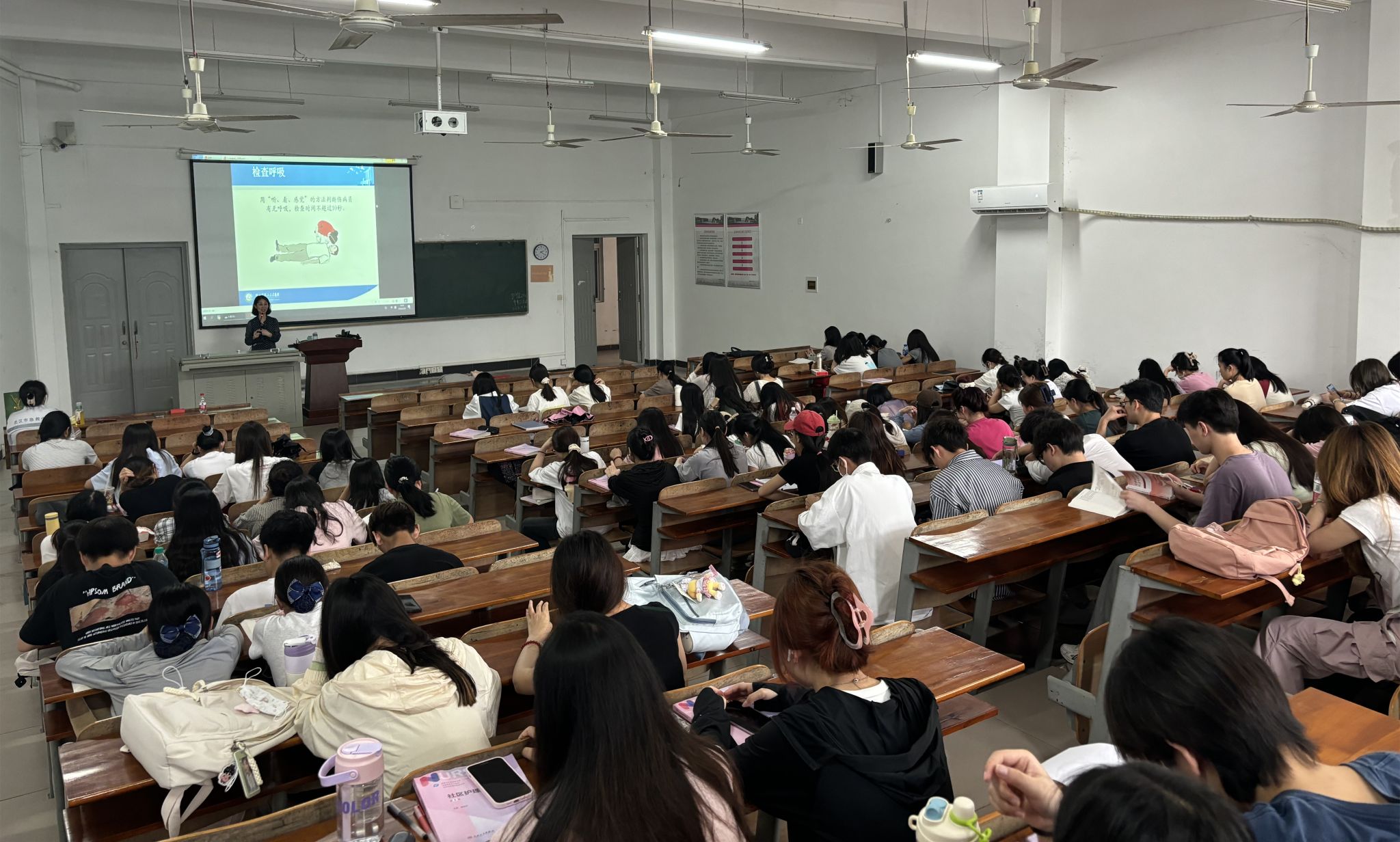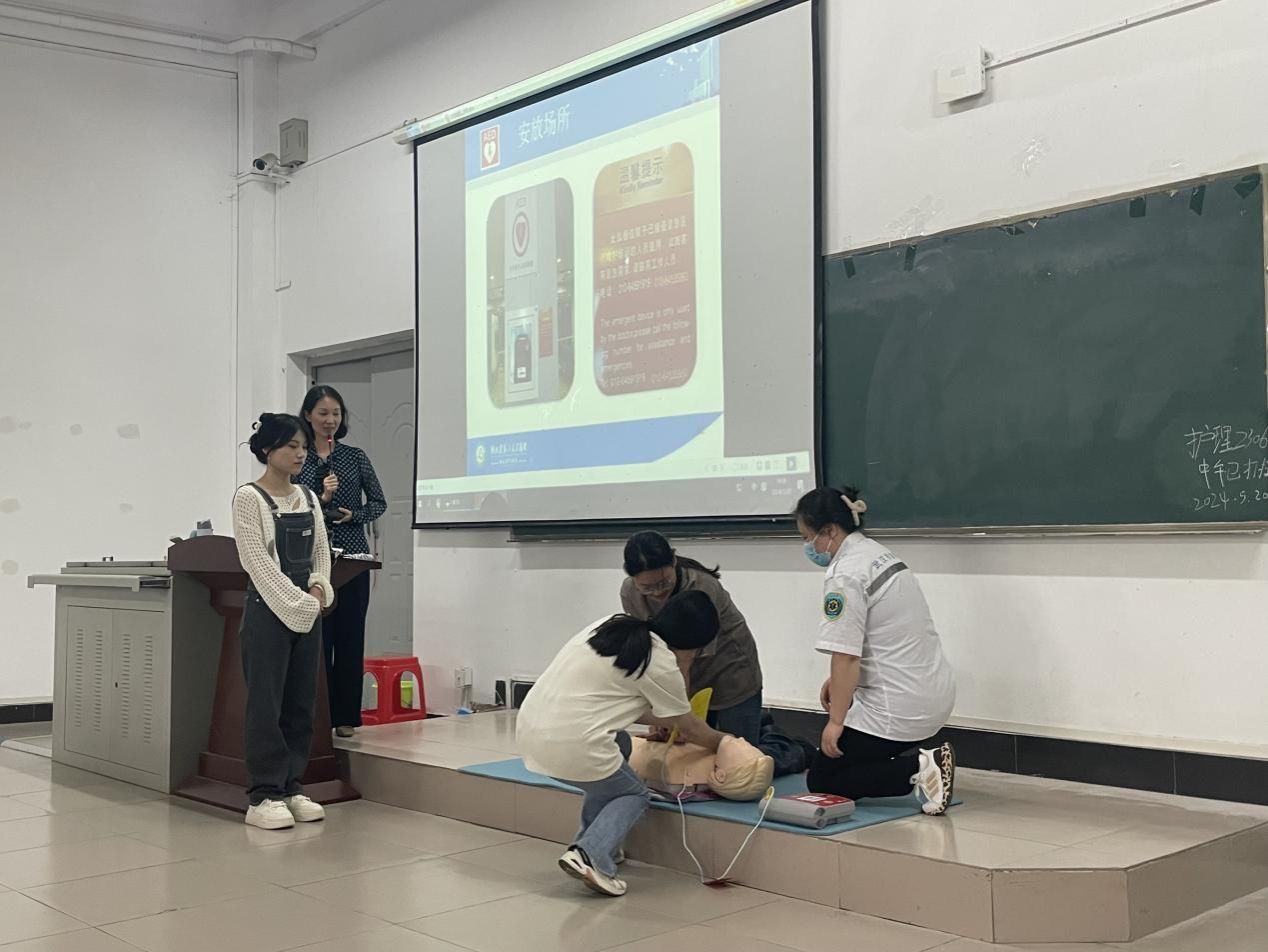 讲座开始前,学院实践教学副院长吴海波对肖芳主任的到来表示热烈的欢迎,并强调了熟练掌握急救技能对护理专业学生的重要性。接着,肖主任以生动的语言、真实的案例,分别就急救重要性、急救基础知识、心肺复苏技术等内容进行了讲解和示范,尤其对如何在事故发生第一时间采取正确、有效的应急措施,最大限度在医生和救护人员到来之前协助挽救生命等方面做了详细的讲解,并现场模拟示范心肺复苏等基本技能;随后“肖芳急救志愿者服务队”的医护人员与同学们一起现场示范,向师生们展示胸外按压、人工呼吸的正确方法,以及如何正确使用自动体外除颤器(AED)。示范结束后,师生代表在医护人员的指导下现场进行胸外按压演练和AED实操;最后,肖主任还讲解了气道梗阻的识别及解除方法——海姆立克急救法,以及该急救法在实际应用中的技巧。肖芳主任生动有趣的讲解,将理论与实际充分结合,师生们受益颇丰。