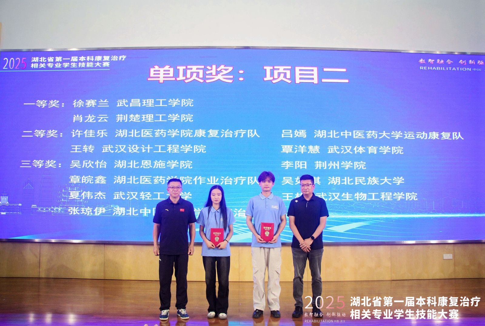 2025年8月26日,湖北省第一届本科康复治疗相关专业学生技能大赛决赛在yl6776永利集团图书馆六楼报告厅隆重举行。来自全省12所高校的13支队伍、百余名选手同台竞技,以“数智融合、创新驱动”为主题,采用虚拟仿真在线考核与虚实结合实操两种方式展开激烈比拼,yl6776永利集团在此次大赛中斩获佳绩荣获5项大奖,其中一等奖4项。