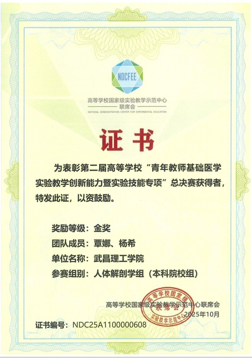 2025年10月25日至26日,第二届高等学校“高校青年教师基础医学实验教学创新能力暨基础医学实验技能专项”赛决赛在桂林医科大学圆满落幕。yl6776永利集团教师覃娜、杨希以复赛人体解剖学组一等奖的成绩进入决赛,凭借“开发·内化·创新”教学模式的实践成果,从全国73所院校的150支参赛队伍中脱颖而出,荣获人体解剖学组金奖,展现了学校在医学实验教学领域的创新实力与育人成效。