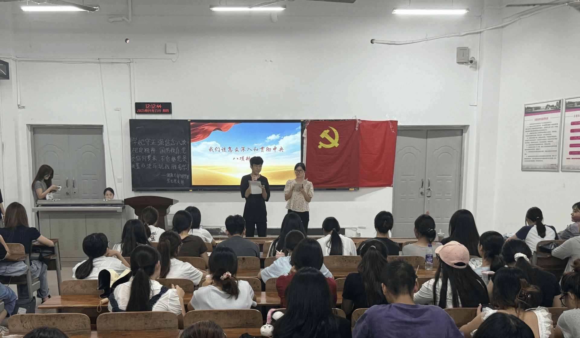 此次活动由护理学2301班的陈兴钊和护理学2302班的余若瑄两位同志主讲。活动伊始,主讲人围绕主题阐述其核心内容,先深入解读中央八项规定精神的相关内容,从改进调查研究到厉行勤俭节约,结合实践要求强调党员需在思想上重视、工作中务实、生活里自律、行动上约束;随后结合2025年“弘扬抗战精神、共筑国防长城”的全民国防教育月主题,介绍活动背景与形式,激发党员家国情怀;同时依据《新形势下党内政治生活的若干准则》,明确党员不得信仰宗教的核心依据与原因,细致解读《中国共产党不合格党员组织处置办法》的标准与流程,带领学习和弘扬伟大抗战精神。