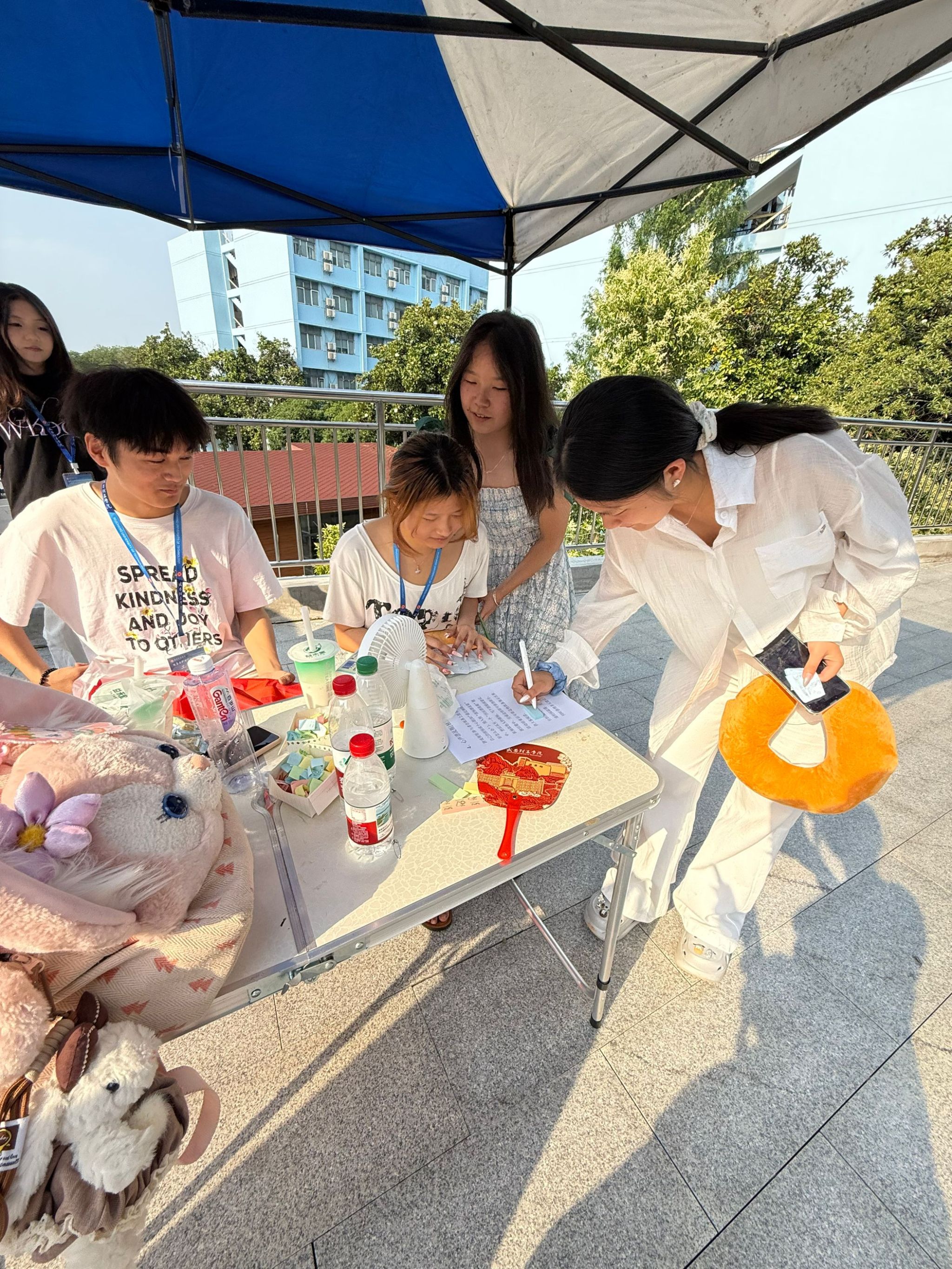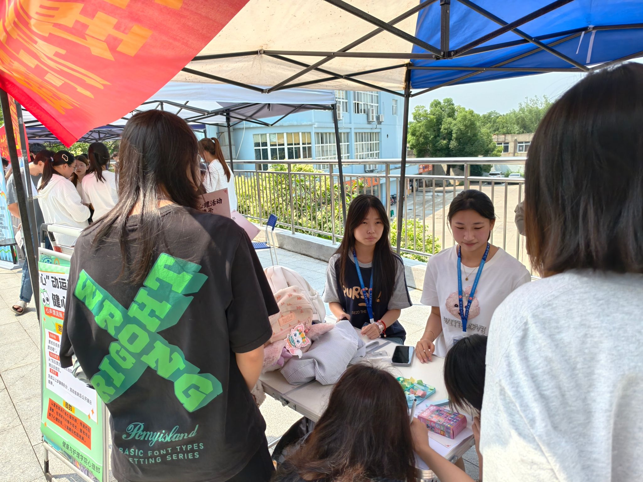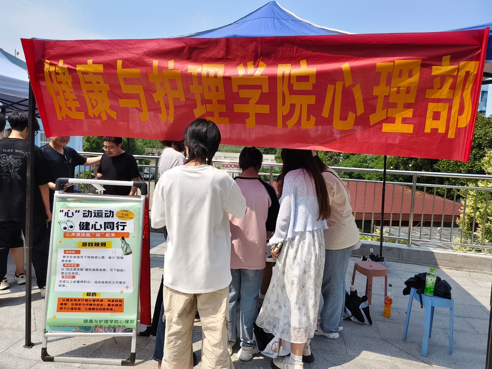 活动现场,热烈的氛围扑面而来。同学们的热情与心理部干事的专注交织成一幅幅温暖的画面。心理部干事们统一佩戴工作牌,穿梭在人群之中,耐心细致地解答同学们的每一个疑问。有的干事站在一旁,时刻关注着现场情况,随时为有需要的同学提供帮助;有的则抱着一摞摞纪念品,按照完成流程为大家有序发放,即便额角沁出细密的汗珠,也顾不上擦拭。在他们的精心组织下,整个活动现场气氛轻松融洽,真诚互动的暖流在场地中流淌,每个人都沉浸在这场心灵的对话中。
