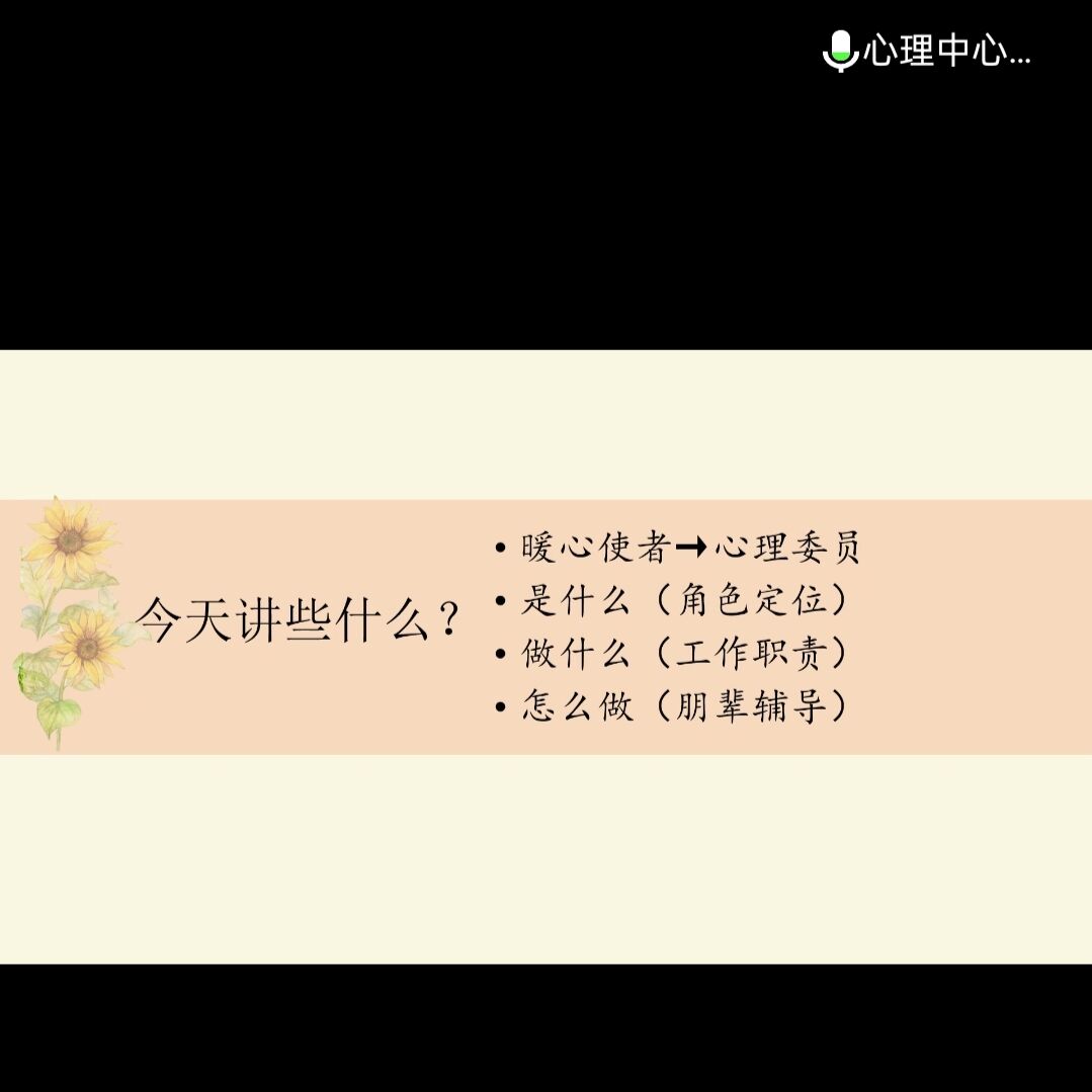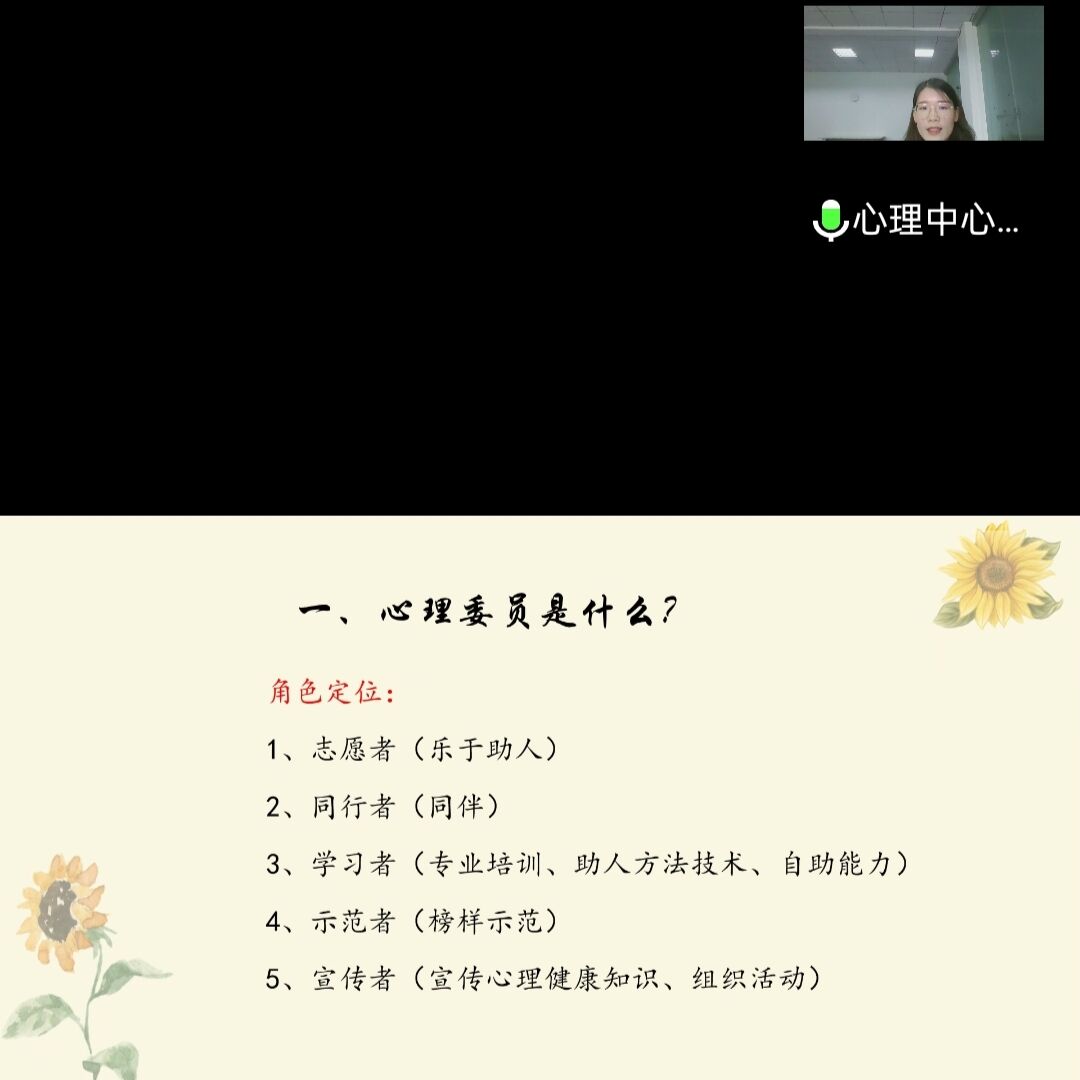 为适应疫情防控常态化形势下学生心理健康教育工作需要,更好地发挥心理委员的骨干作用,提升学生心理互助服务水平,4月25日下午,心理健康教育中心面向全校心理委员举办主题为“疫情防控常态化下如何做好一名暖心使者”的线上培训讲座。此次培训主讲人为心理中心专职教师王婉老师,分为两场进行,第一场主要面向大一心理委员,时间是下午14时至15时30分;第二场主要面向大二与大三心理委员,时间为下午16时至17时30分。 培训伊始,王老师先为大家播放了一条心理健康宣传视频,短片深刻诠释了“健康心理 快乐人生”的重要性。接着,讲座从心理委员是什么、做什么以及怎么做三个方面展开,向大家介绍如何做好一名暖心使者。