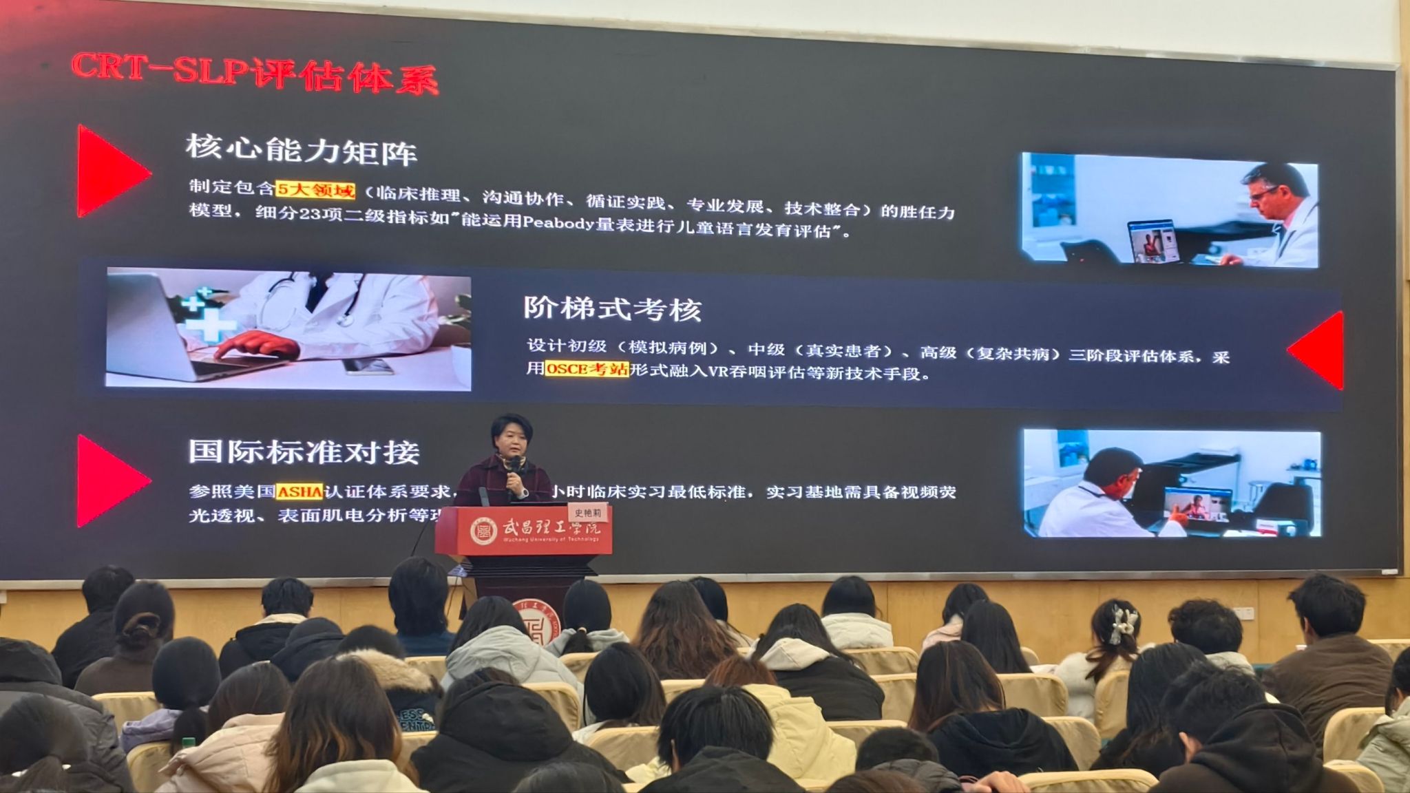 史艳莉教授首先剖析了言语治疗跨学科的崛起逻辑,指出多学科融合需求、技术驱动创新与患者中心理念深化是该领域发展的核心动力;在政策层面解读了国家对康复医疗的顶层设计与专项支持,全方位展现了康复人才培养的政策利好;针对教育改革,她提出“从单一治疗到交叉融合”的核心思路。同时,她展示的高校言语治疗交叉学科课程与就业数据、2025优化版课程结构占比图表也印证了交叉融合的教育趋势。