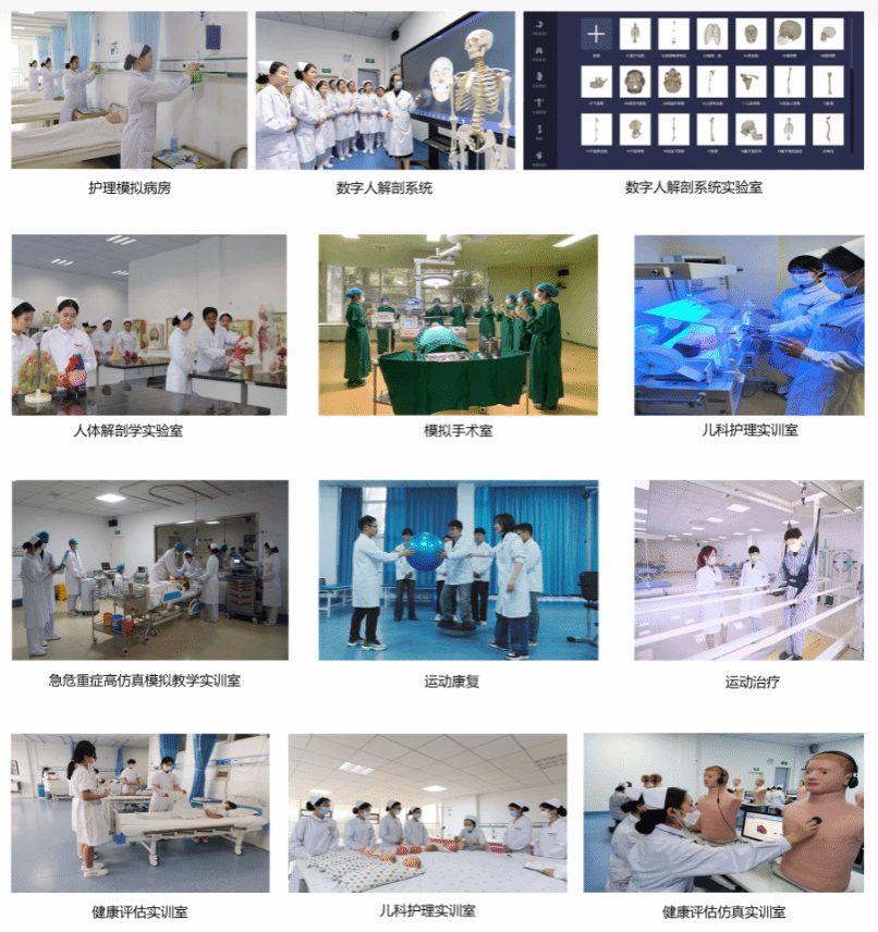 优良的实验实训教学条件 校内临床实践教学中心为省级实践教学中心,包含护理专业实训、康复专业实训和医学基础实验三个部分,配备有虚拟仿真实训系统、SimMan3G高仿真模拟人、SIMMOM高级分娩模型、综合置管护理技能虚实结合训练平台、心肺复苏虚实结合互动训练系统、数字人解剖系统、人体姿势稳定性诊断分析系统、数字评估训练系统、三维步态分析系统等先进的仪器设备,有AI技术驱动的交互式多媒体互动实践教学系统,构建了AI赋能的实验实训学习环境。